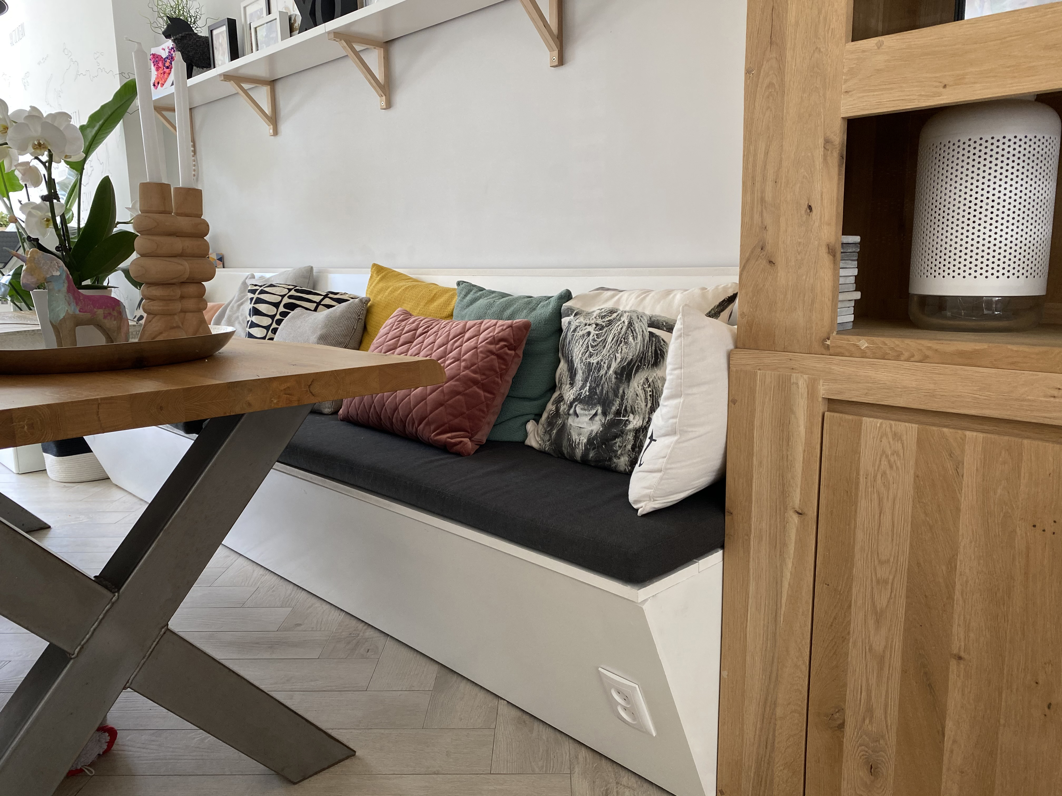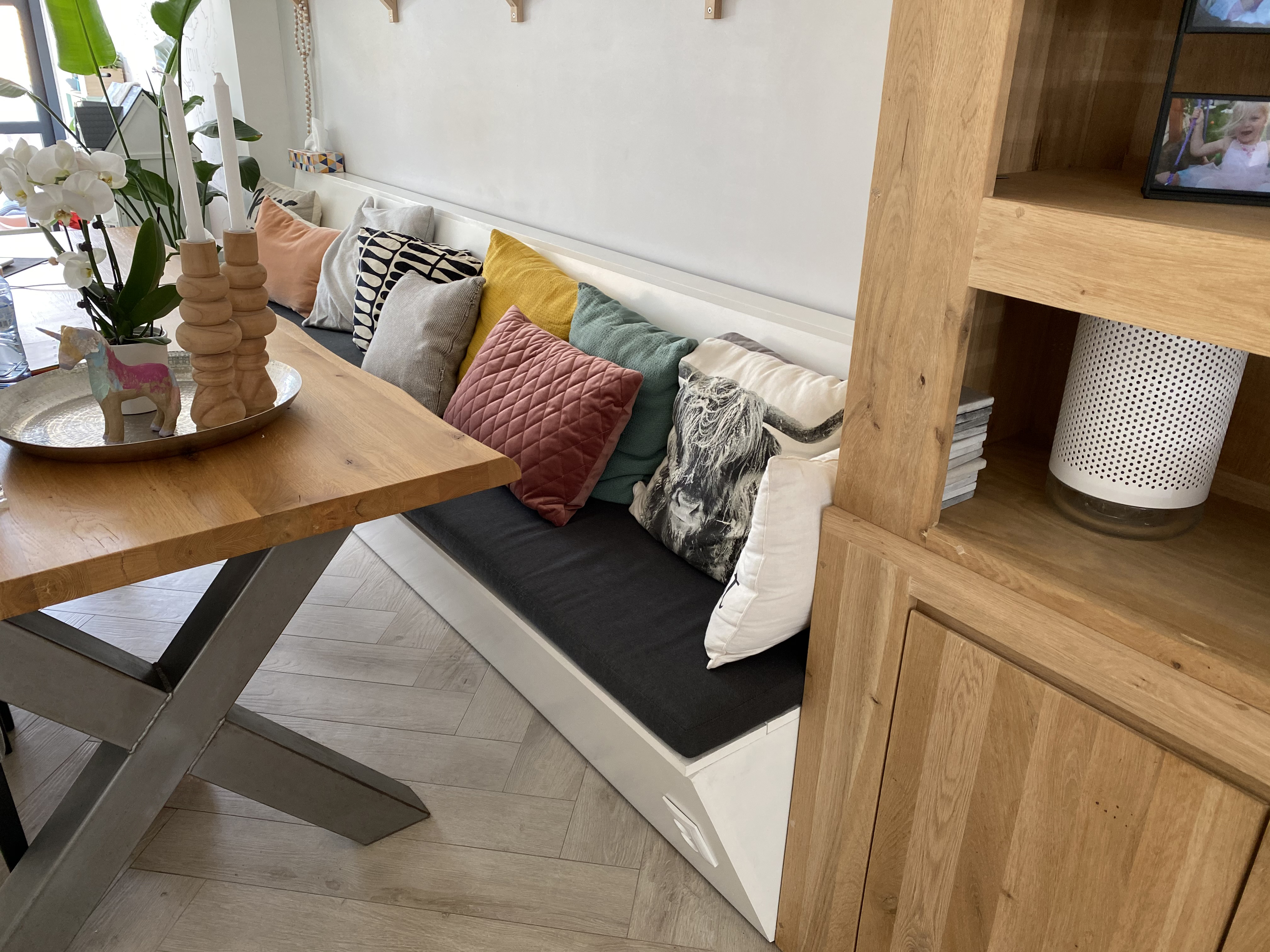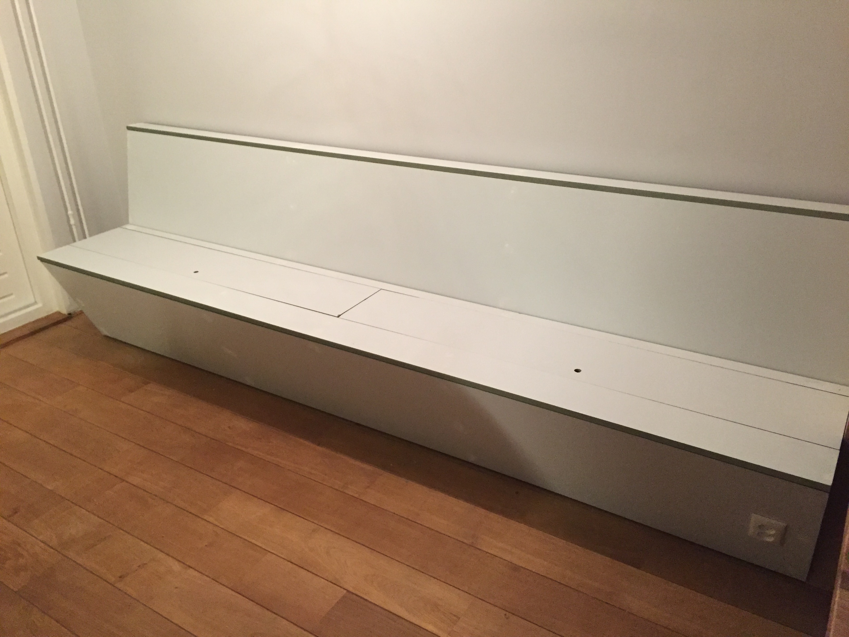 Zitbank gemaakt van groen MDF met hoge zit en opbergruimte onder het zitvlak, stopcontacten.