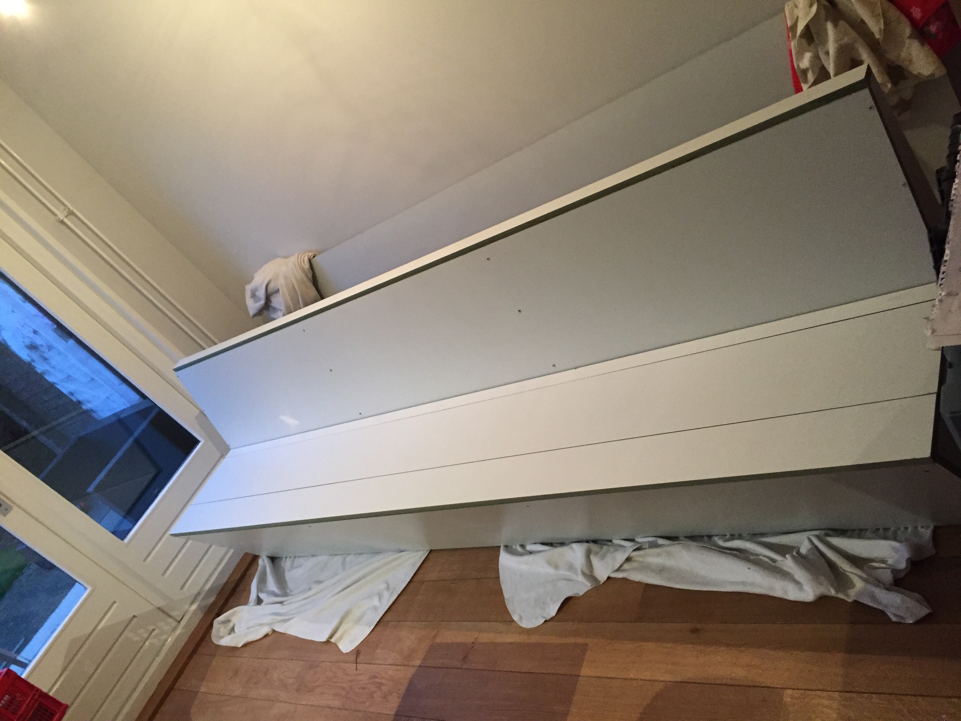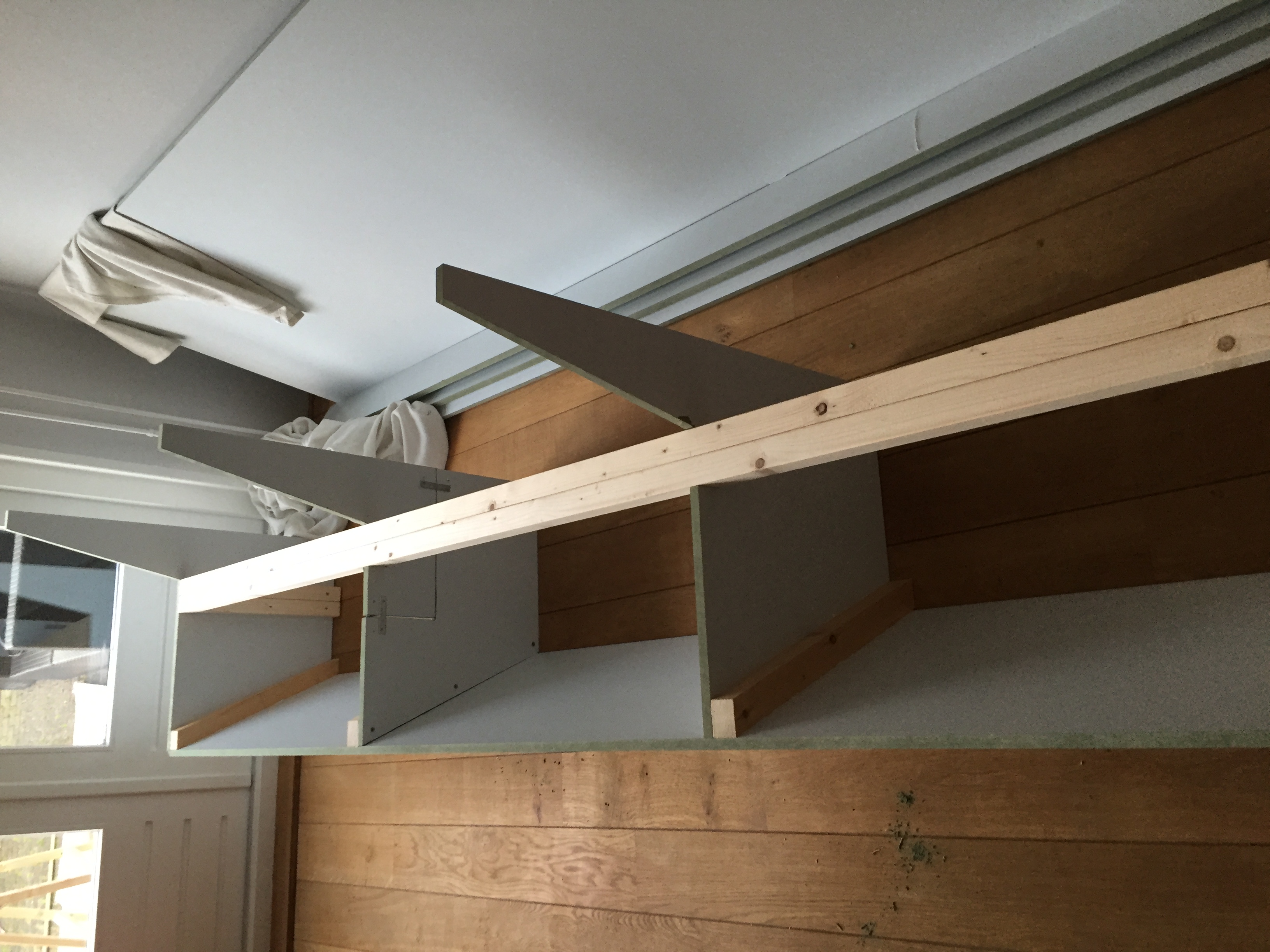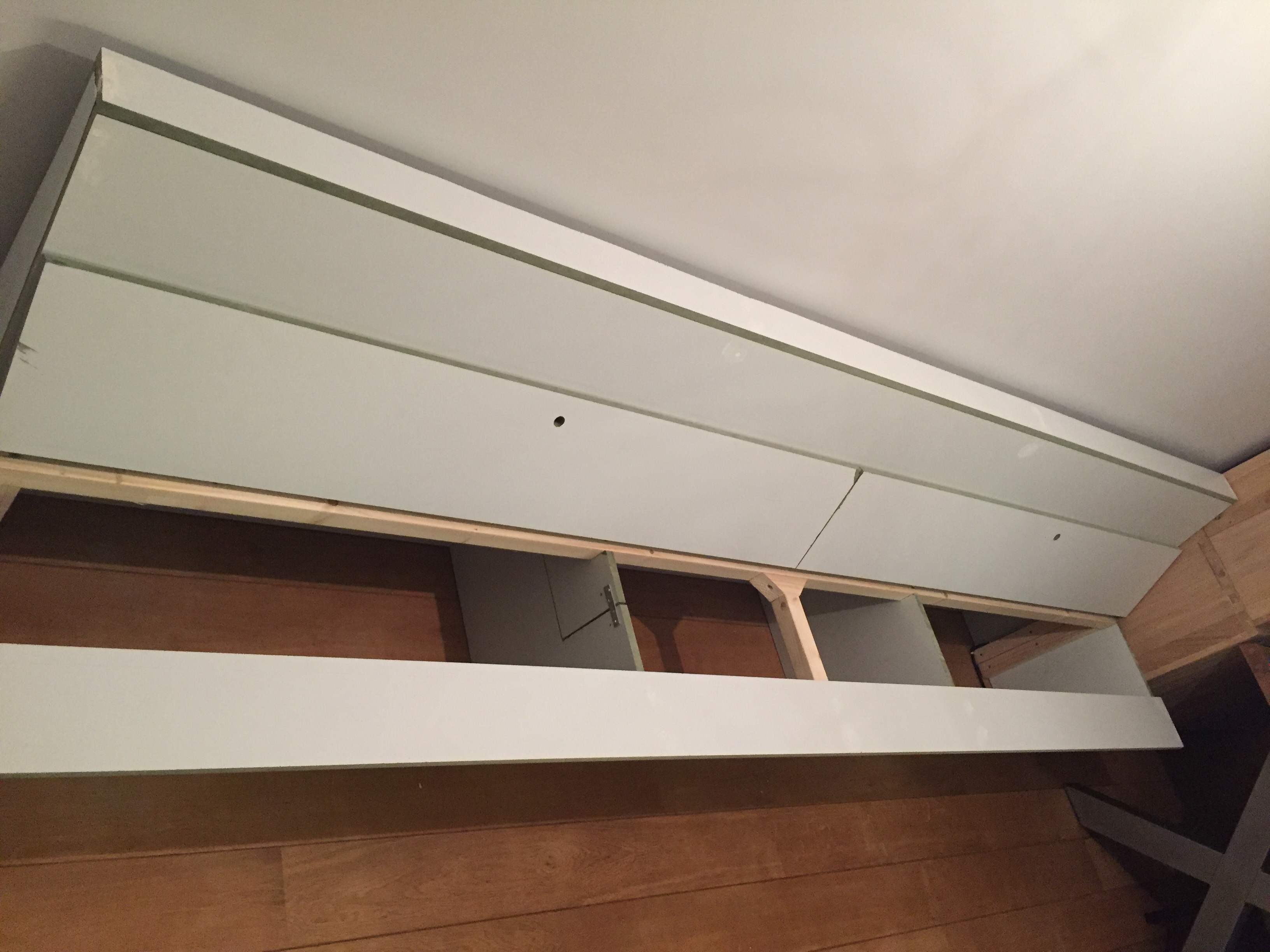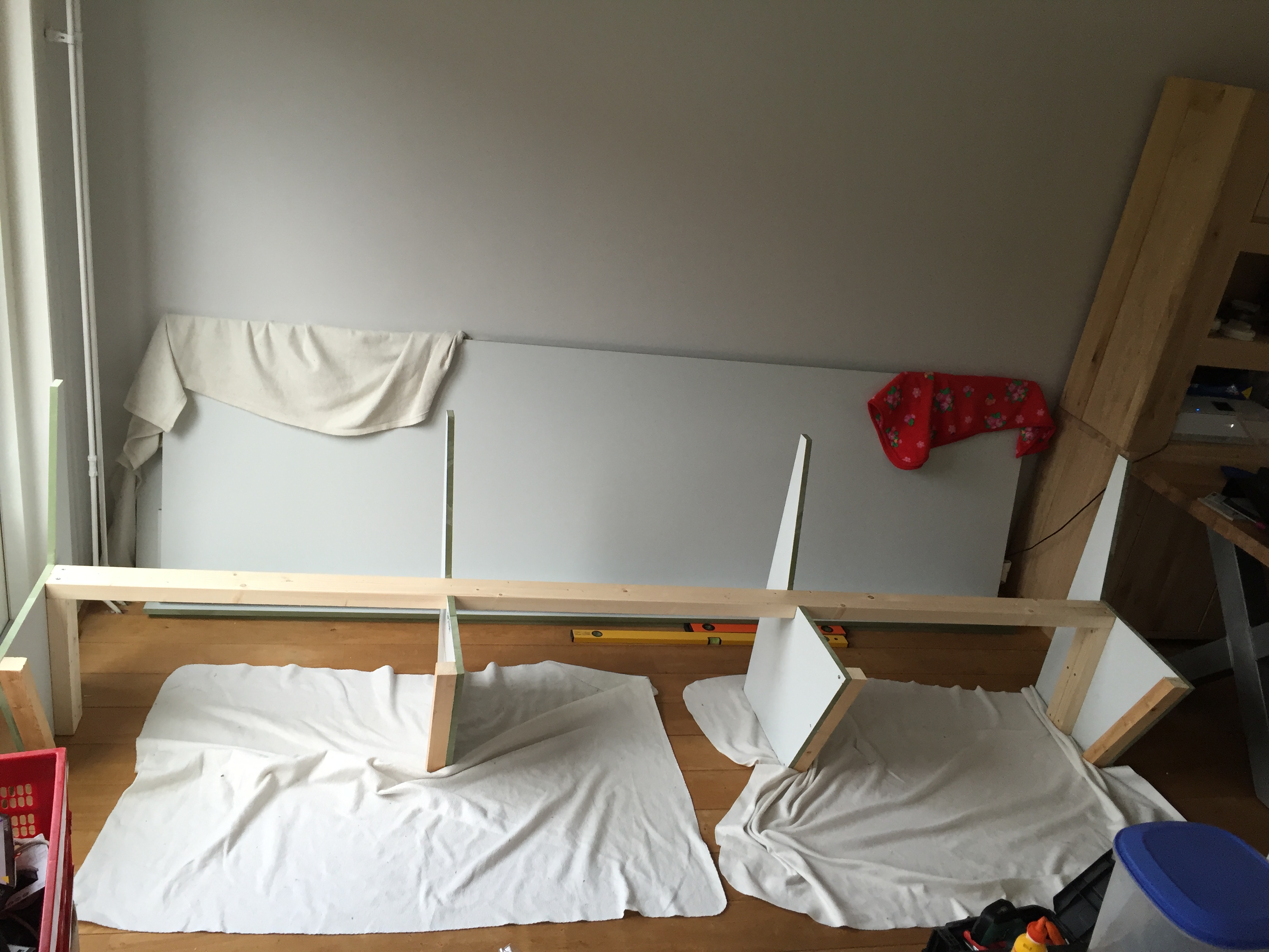 Zitbank gemaakt van groen MDF met hoge zit en opbergruimte onder het zitvlak, stopcontacten.