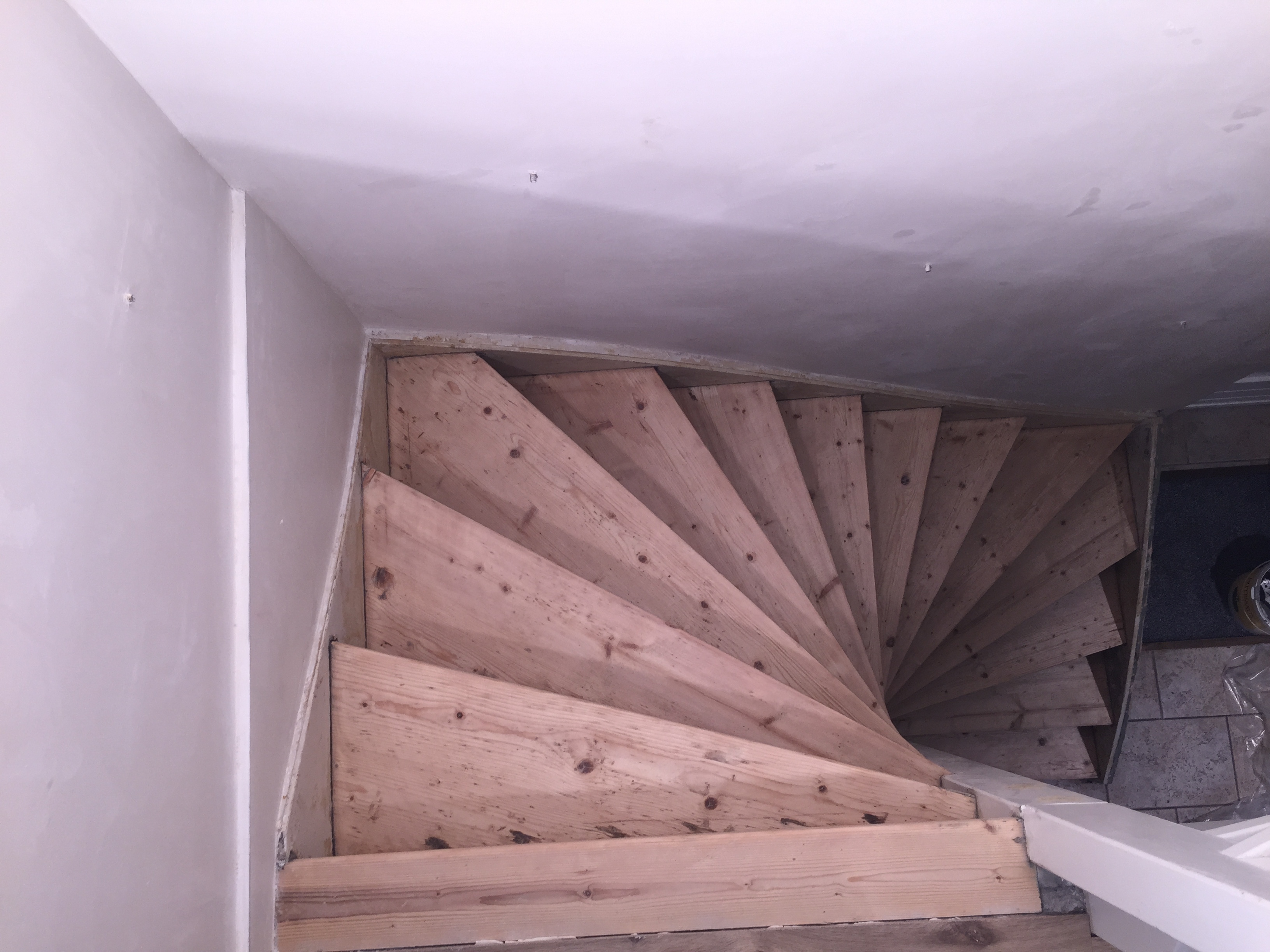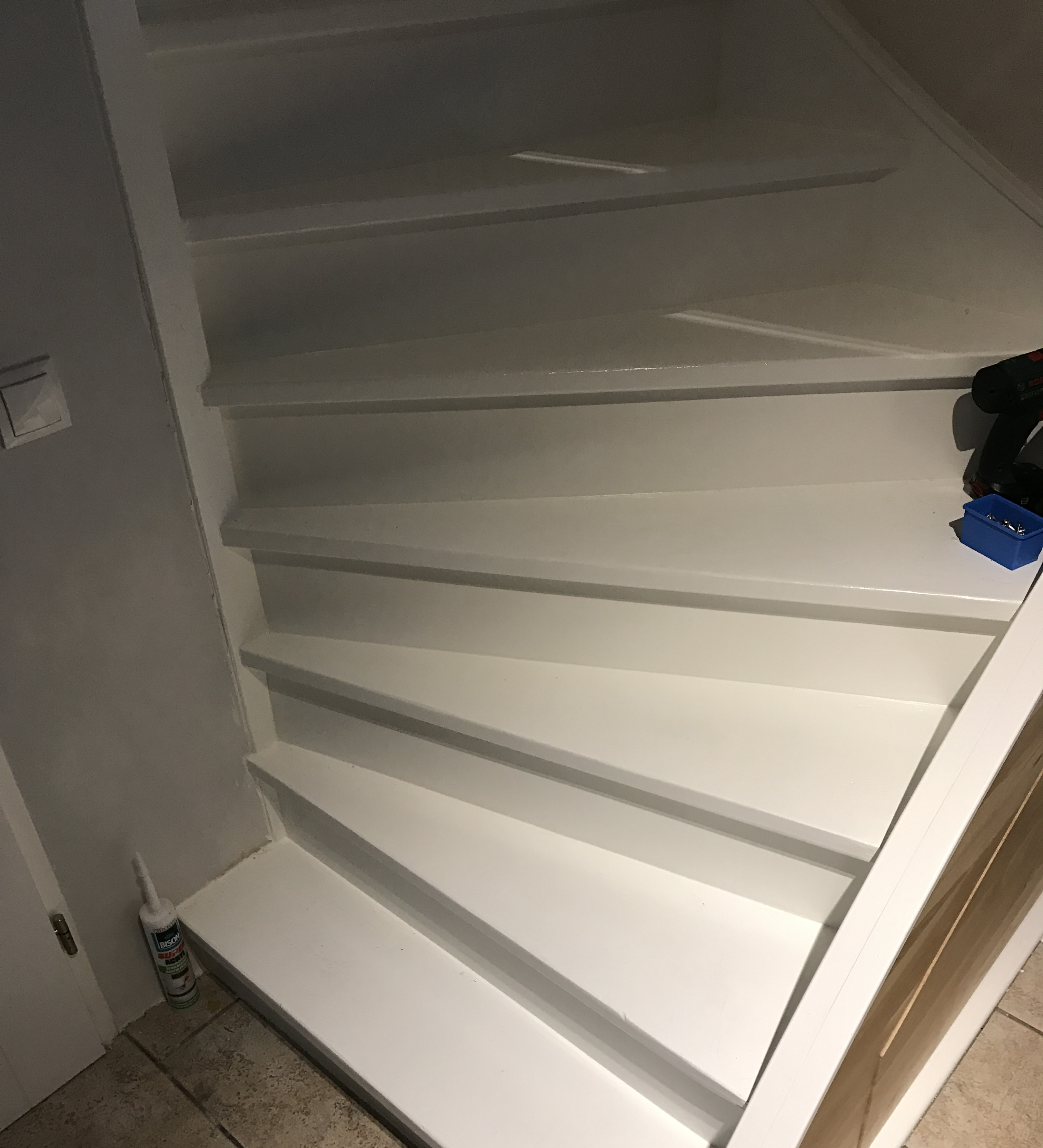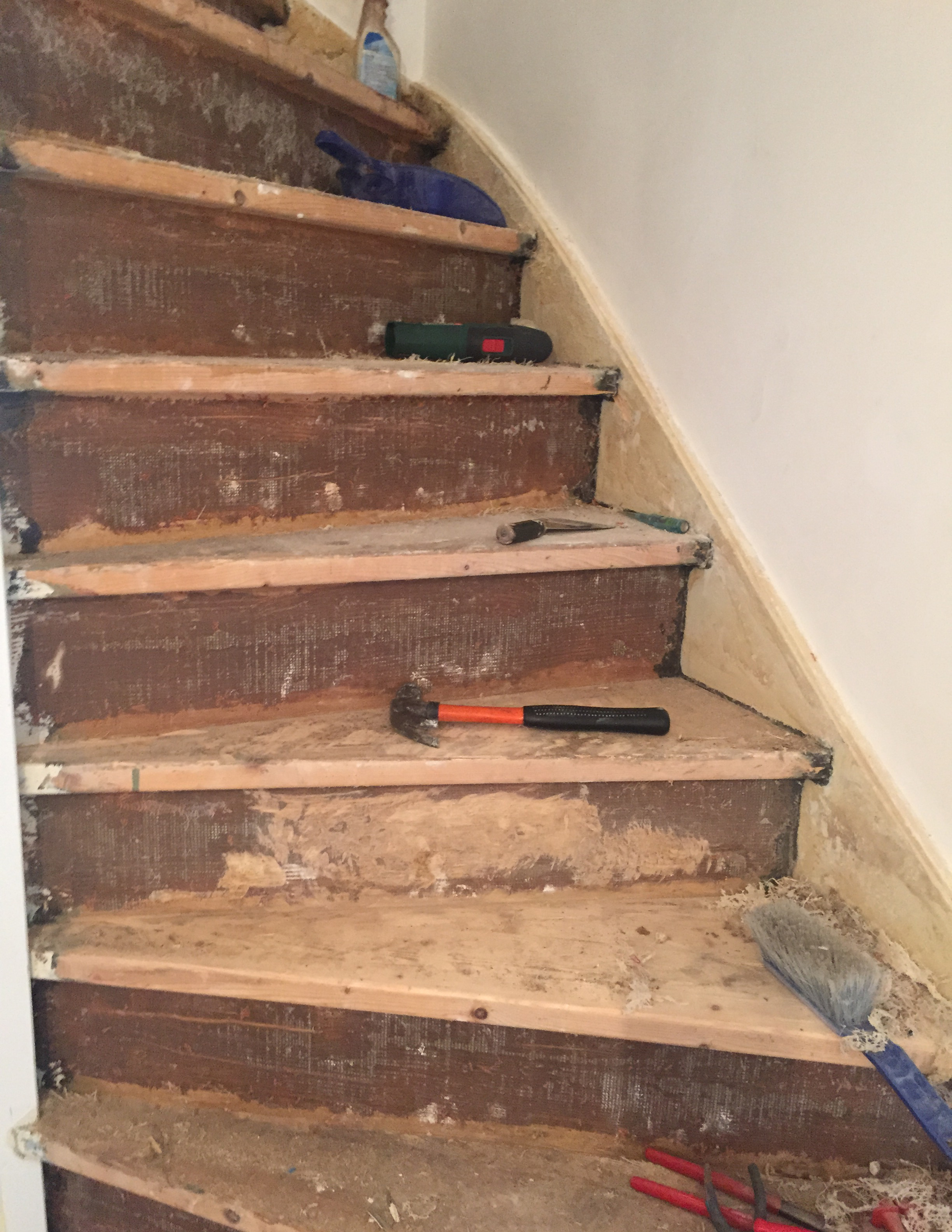 Volledige traprenovatie. Vloerbedekking verwijderd, inclusief lijmresten van 3 verschillende lagen vloerbedekking, nietjes en nagels. Vuren schoon geschuurd, stootborden vervangen, wit afgelakt.