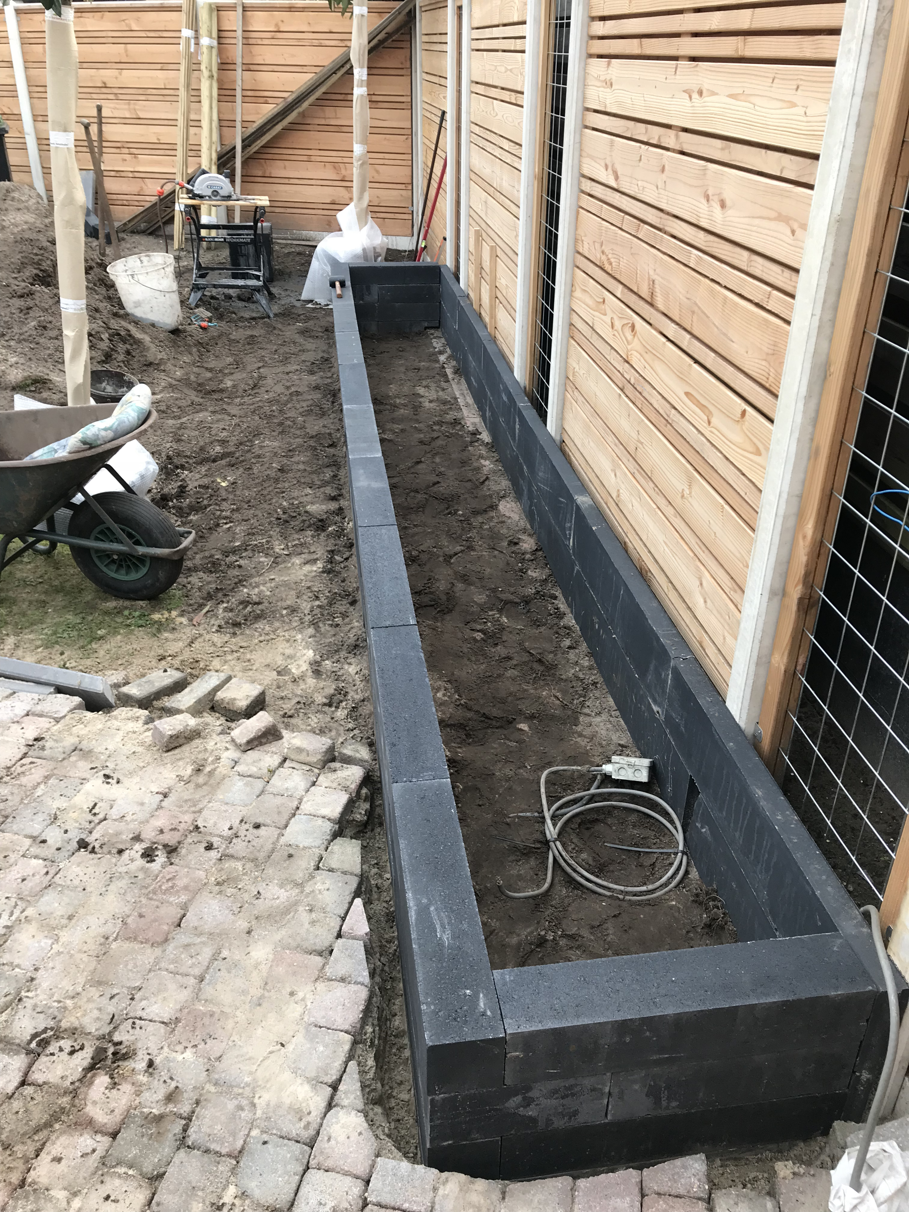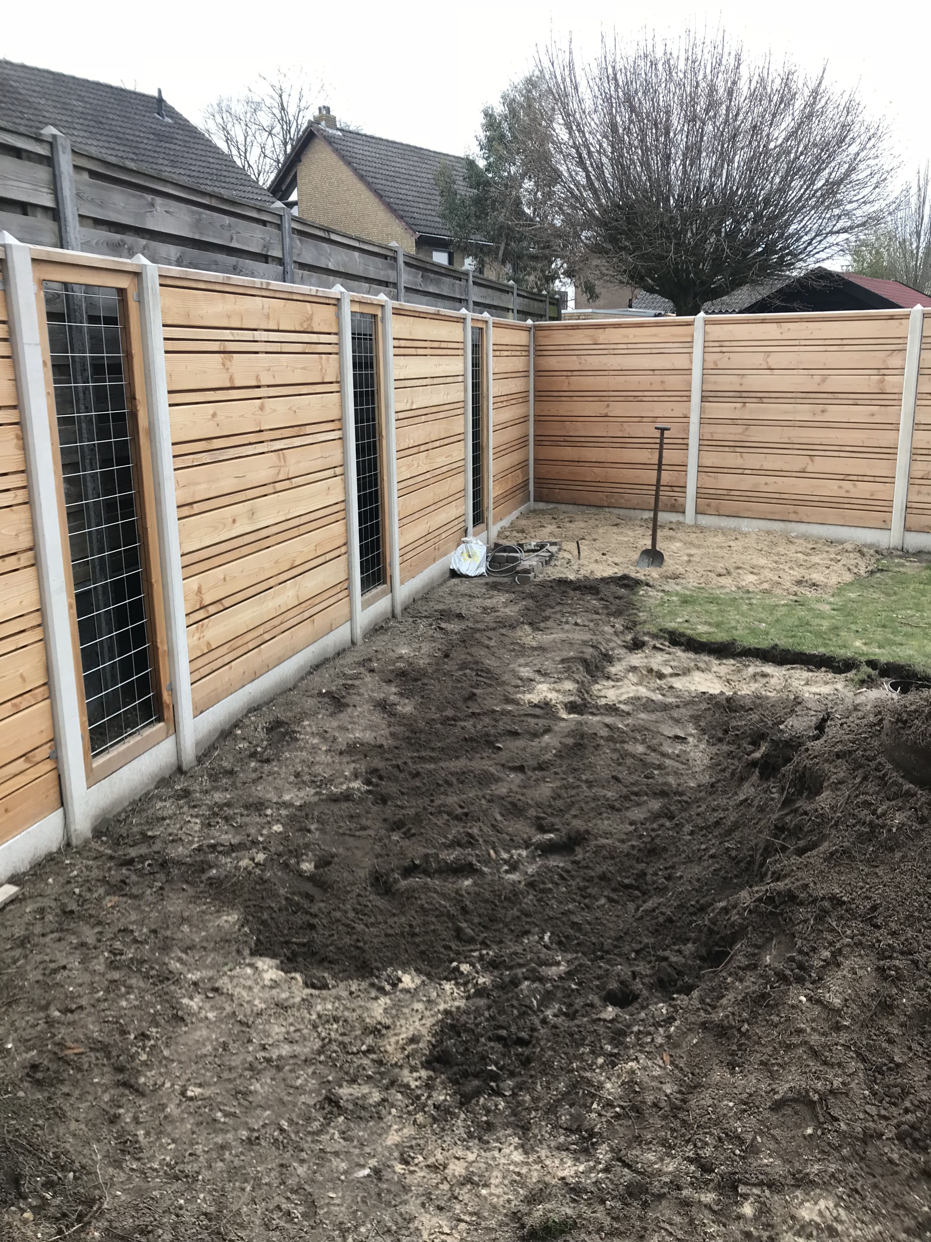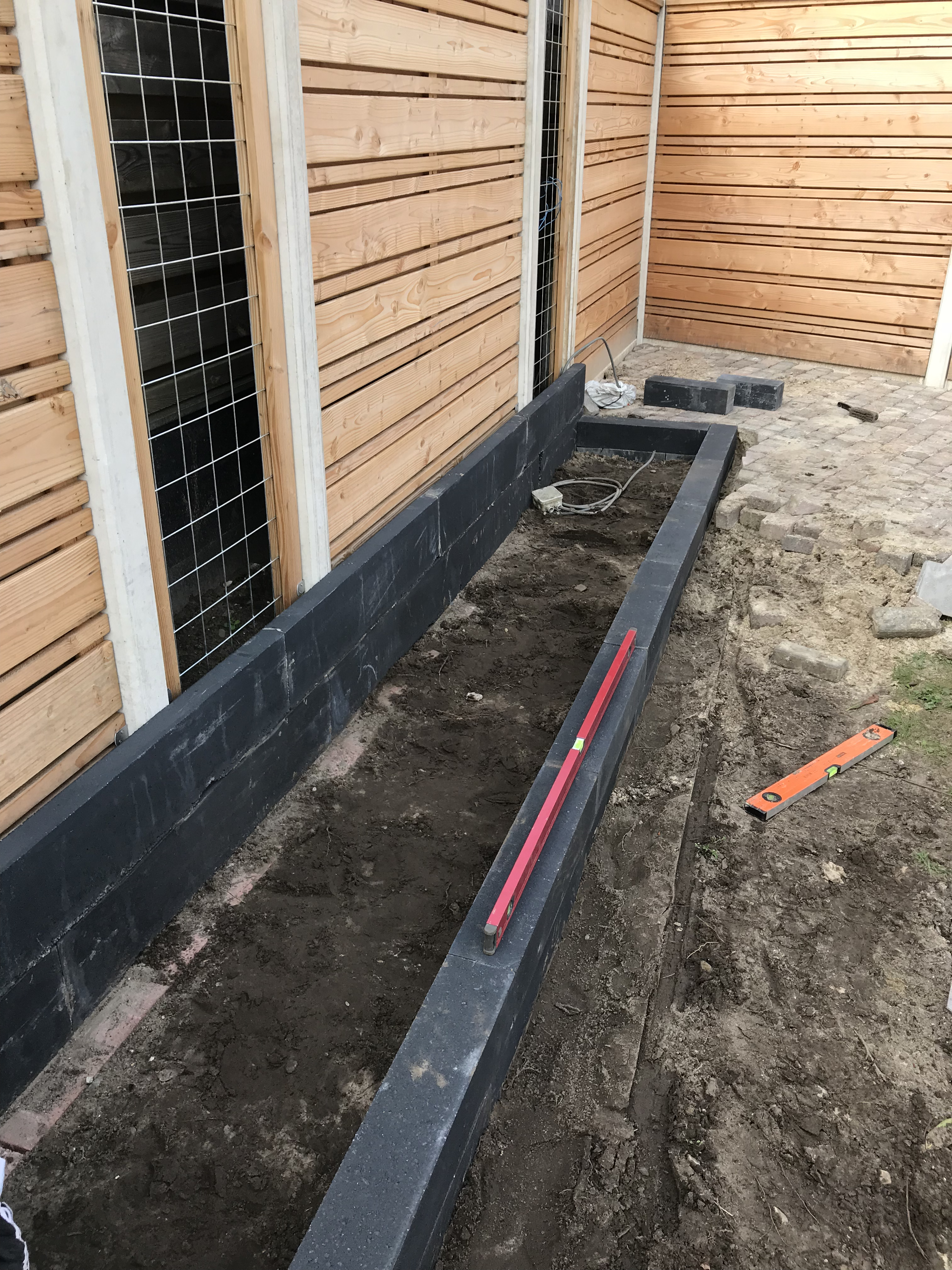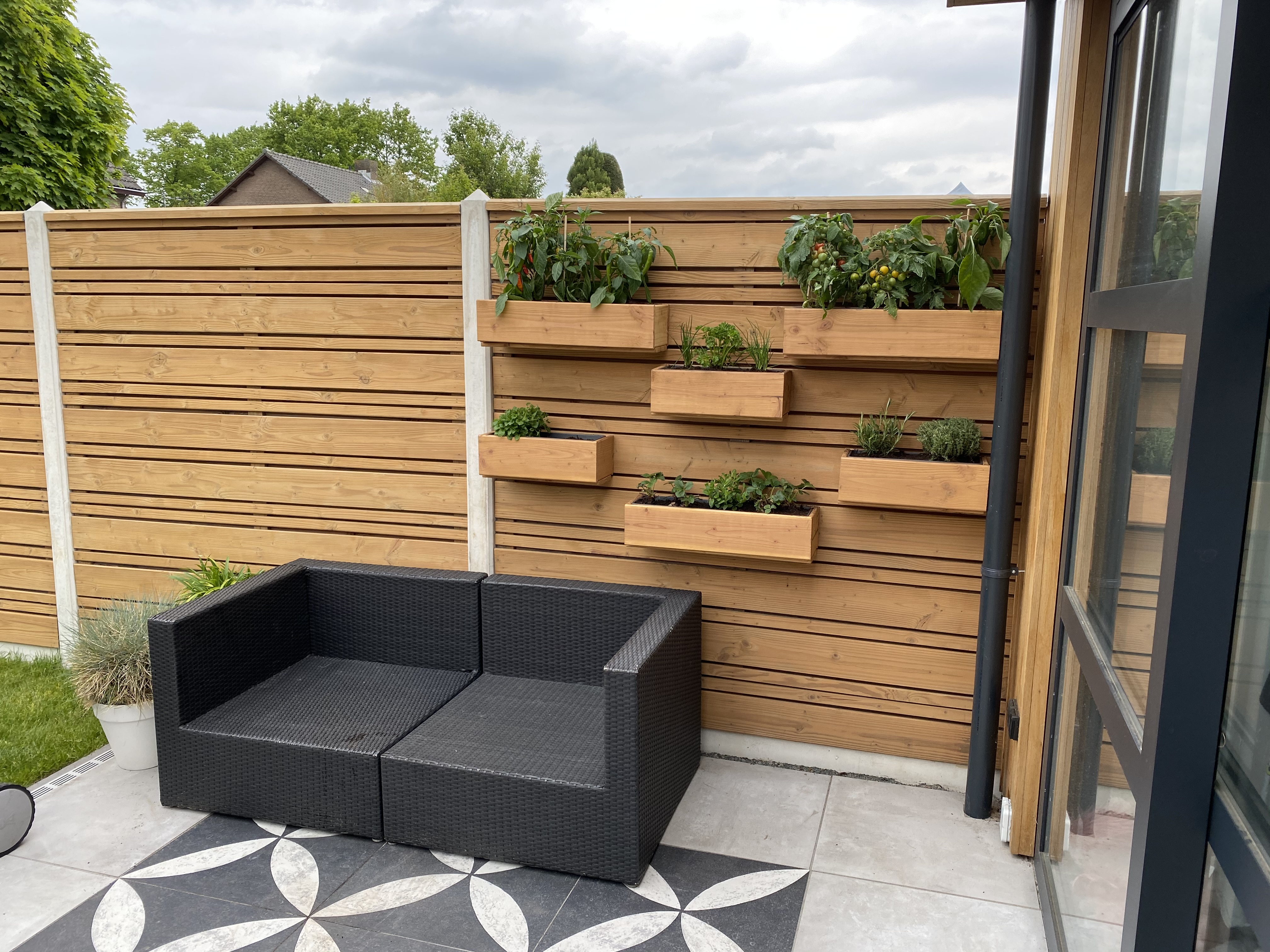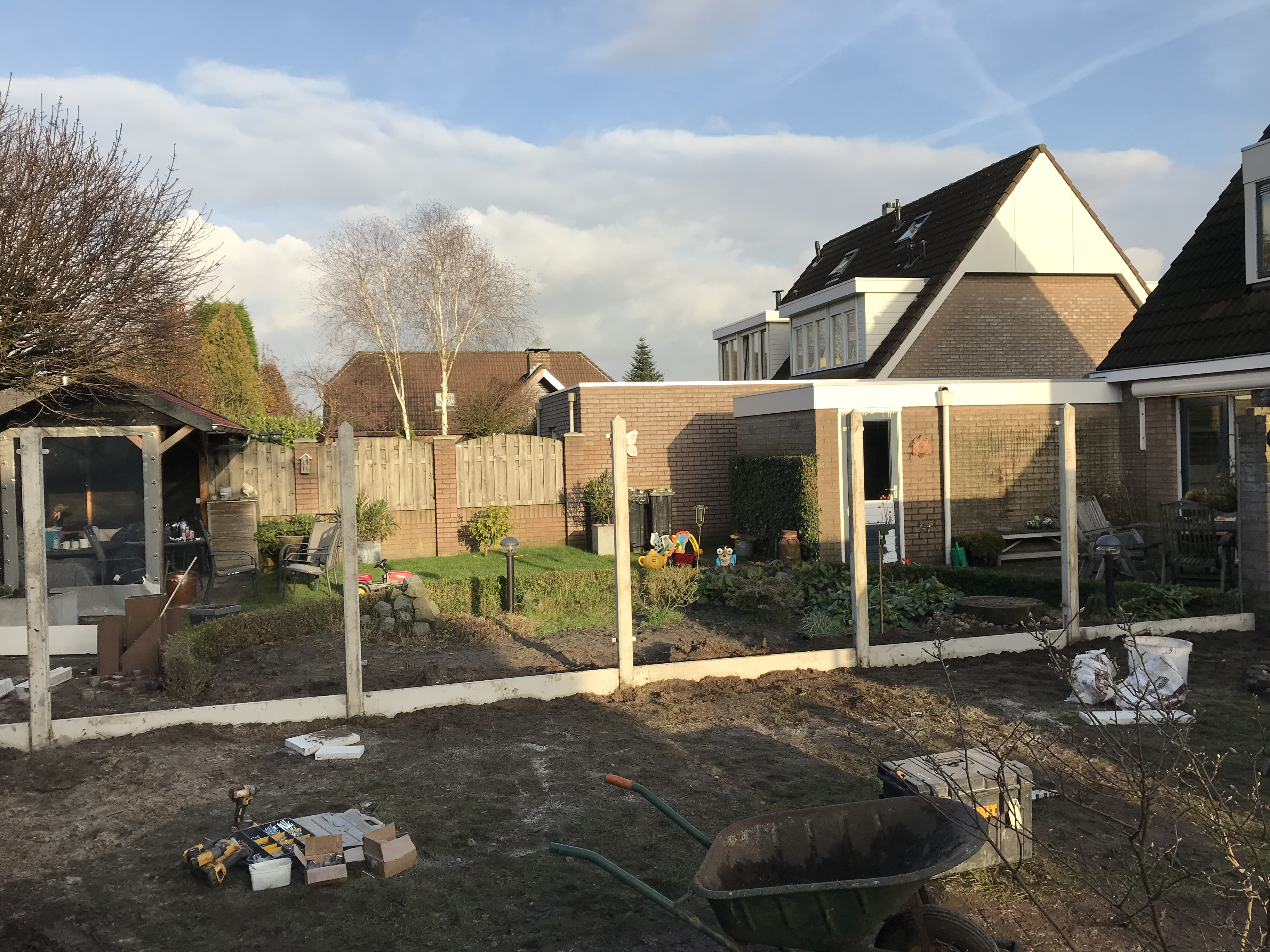 Volledige tuinrenovatie inclusief verwijderen van alle beplanting (oa coniferen), plaatsen van Douglas schutting met witte betonnen palen en onderplaten, plaatsen border bakken, stucen en schilderen van border bakken, plaatsen van laurier leilindes, verlichting en vaste spanning, leggen terras (Bonte klinker waalformaat) en leggen grasmatten. Daarnaast hangende plantenbakken/moestuintje gemaakt van gladde geschaafde Douglas planken met daarin plastic Elho plantenbakken.