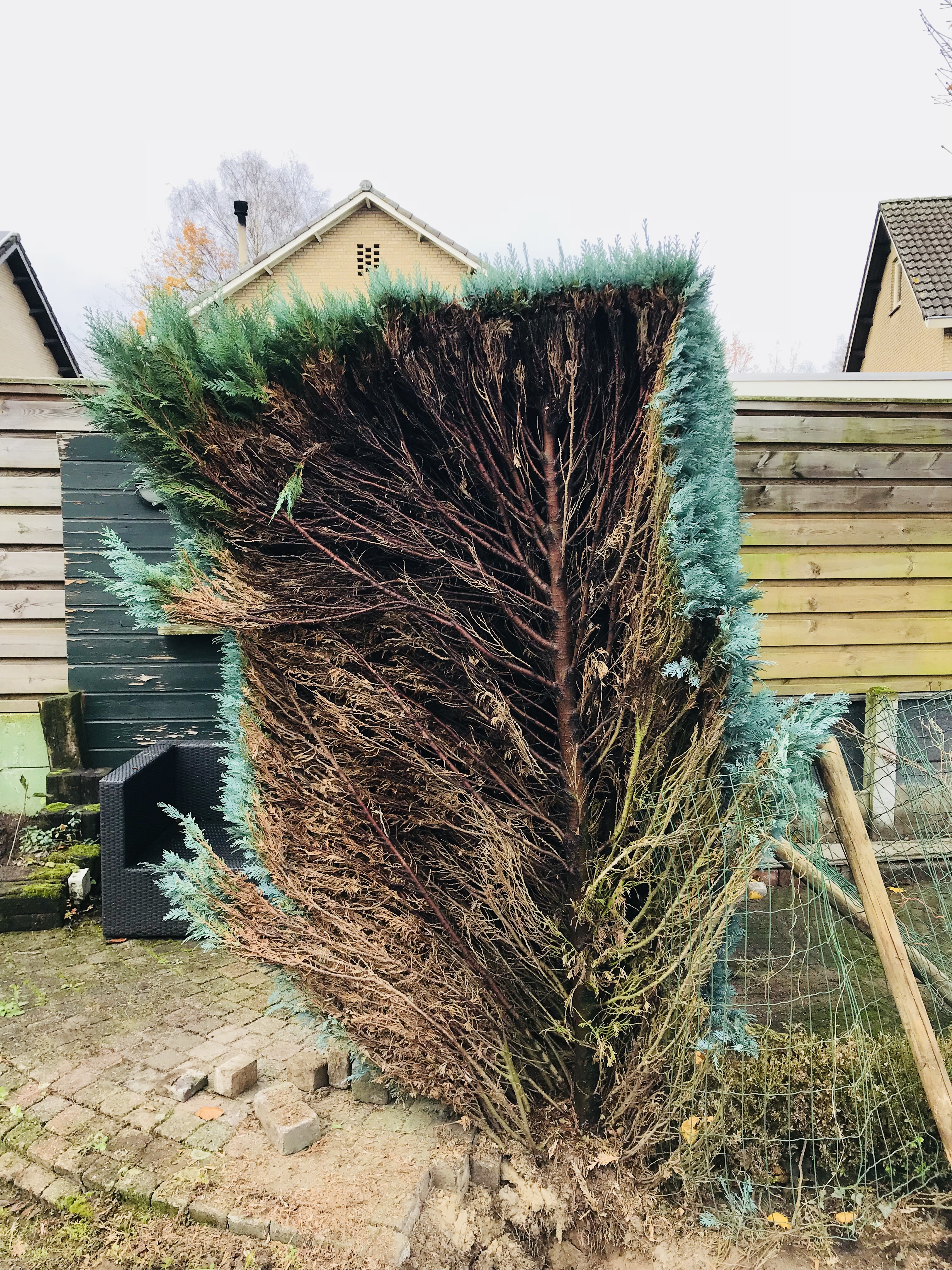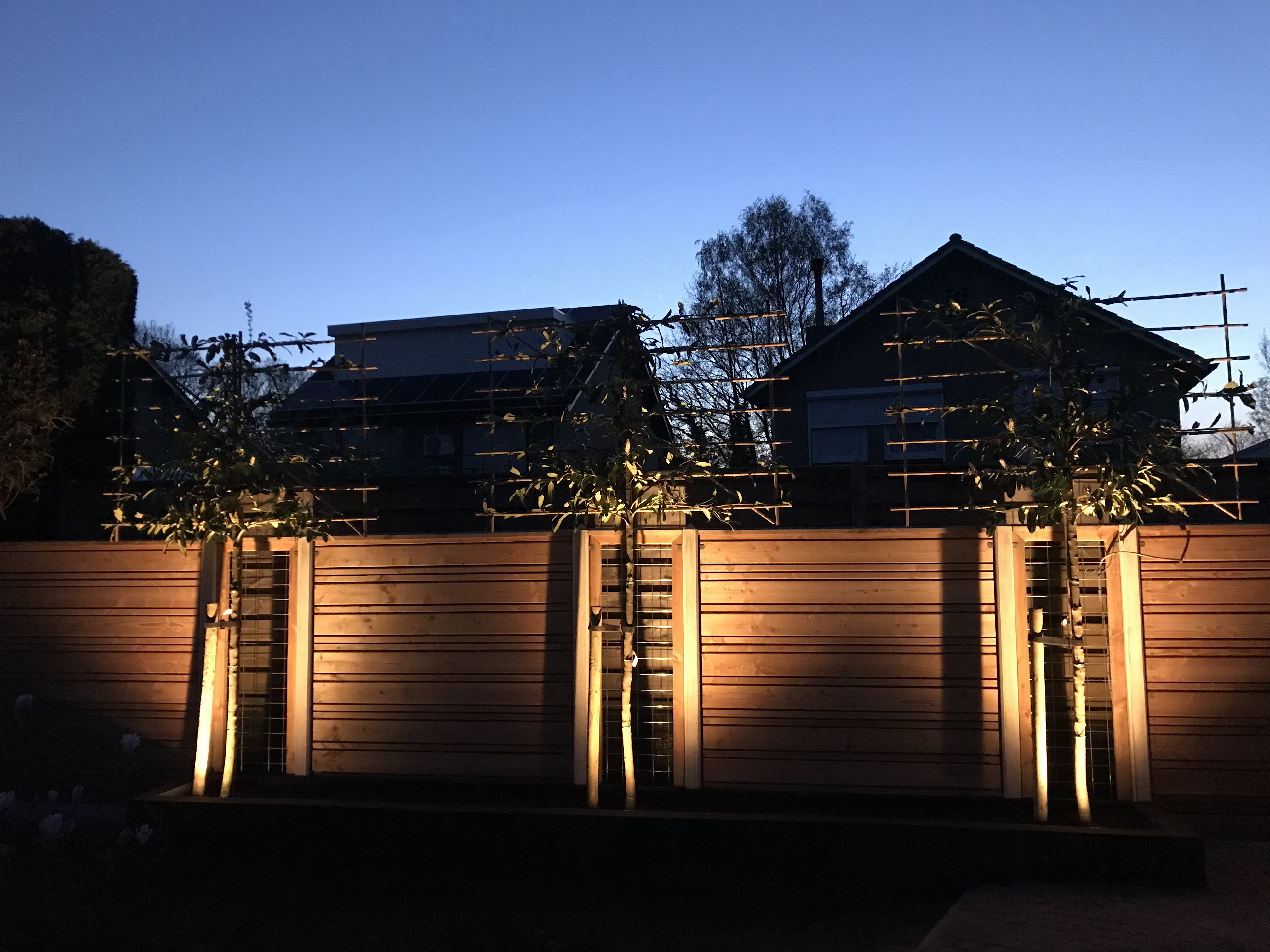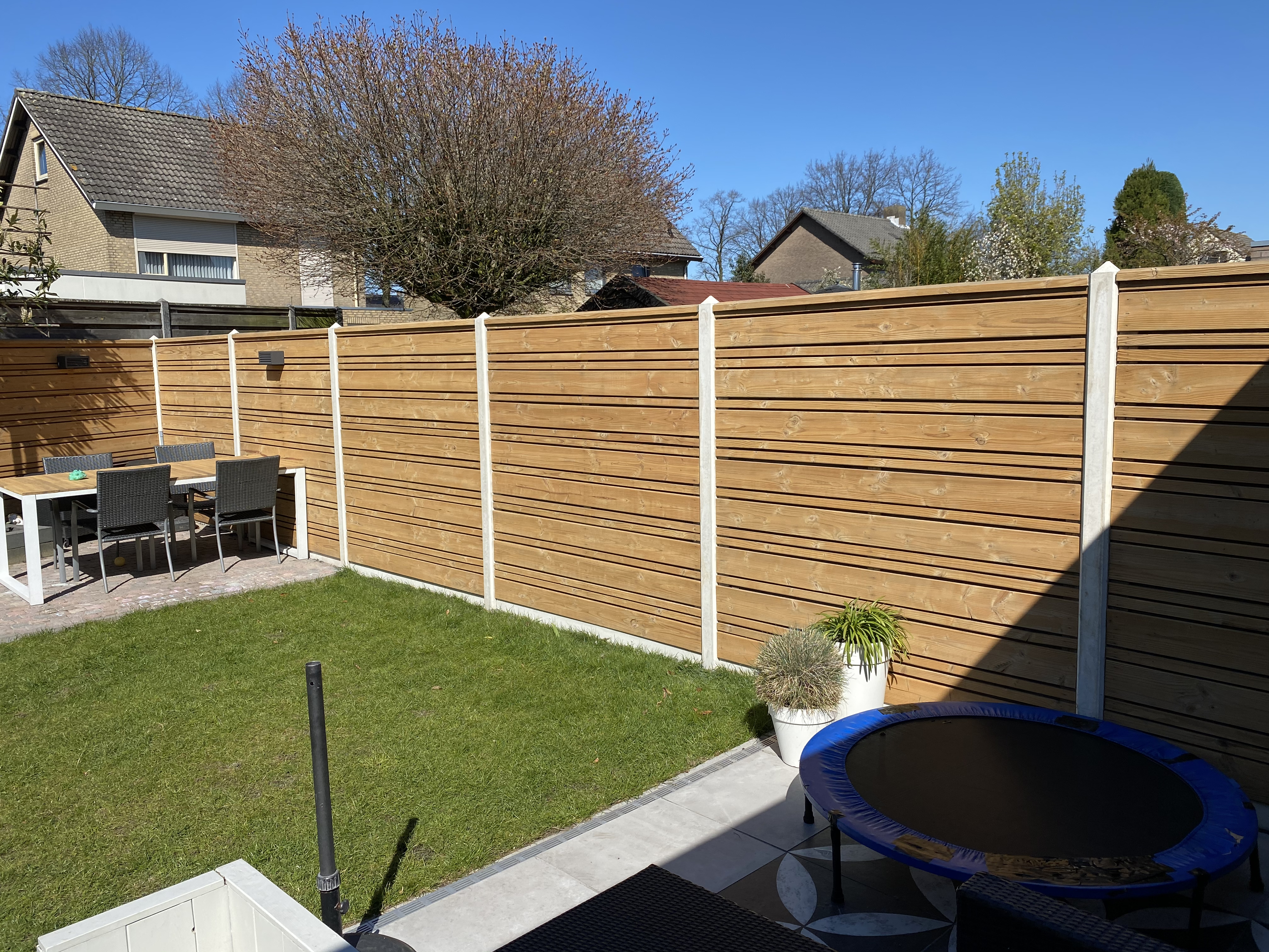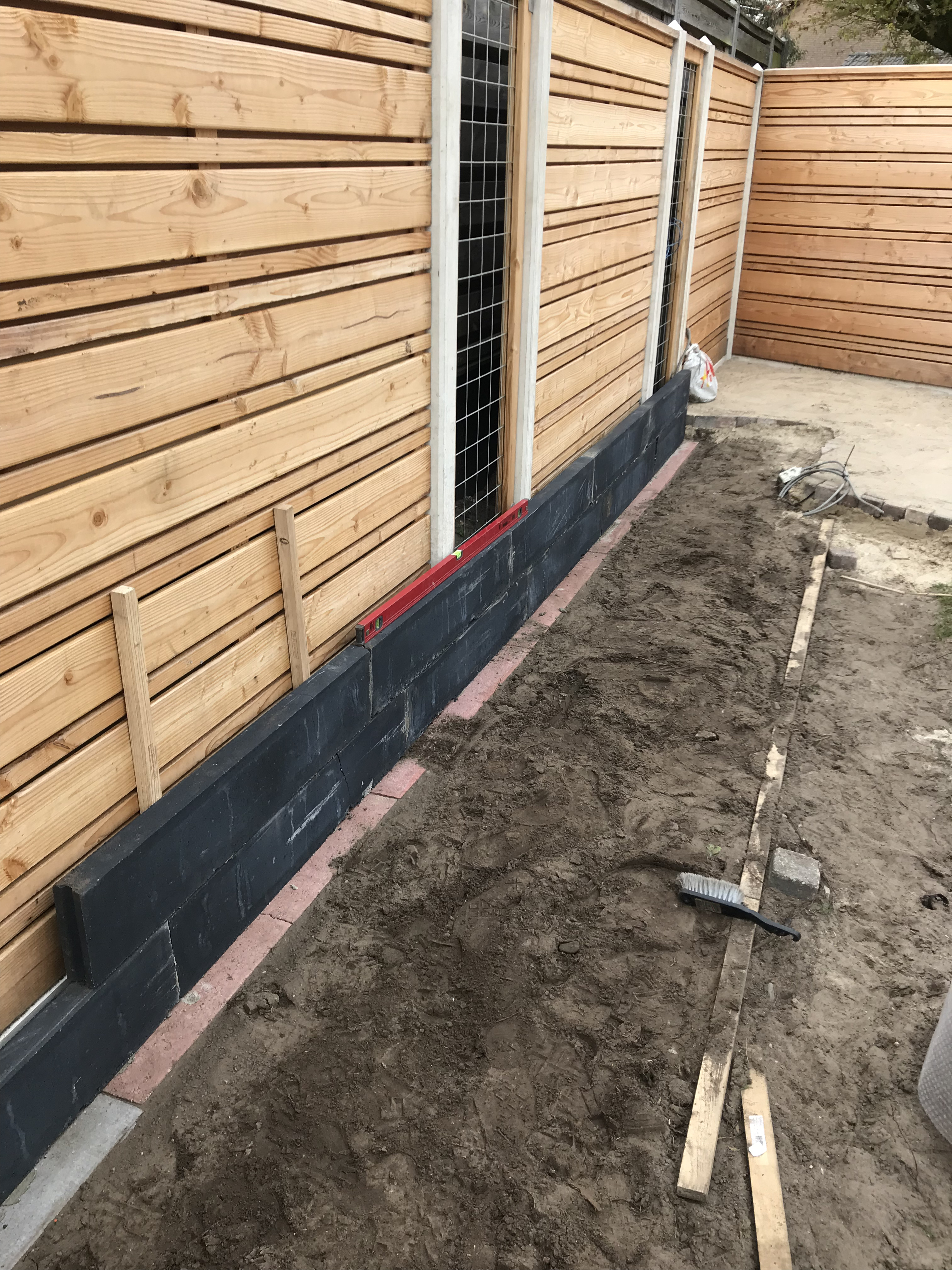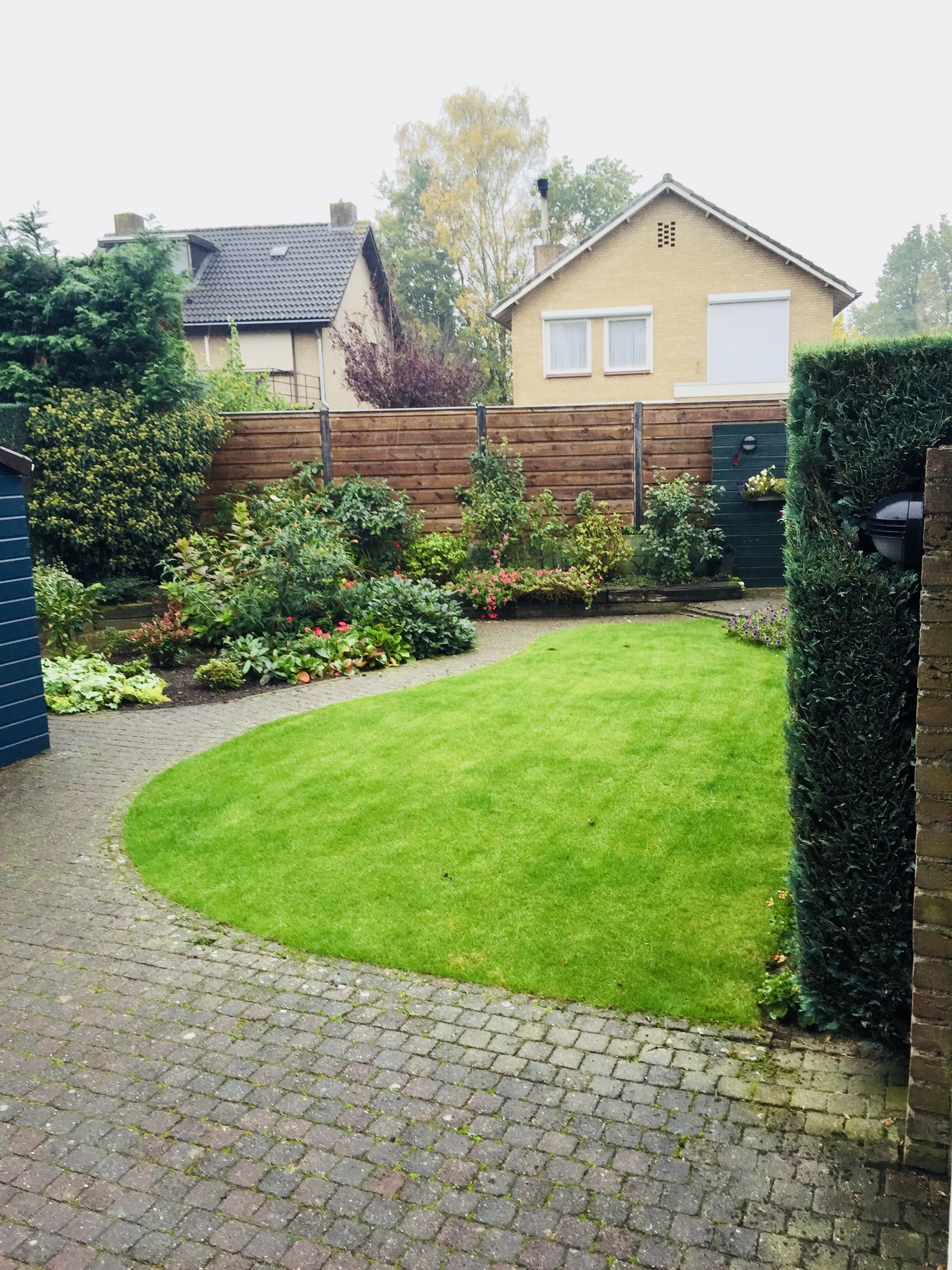 Volledige tuinrenovatie inclusief verwijderen van alle beplanting (oa coniferen), plaatsen van Douglas schutting met witte betonnen palen en onderplaten, plaatsen border bakken, stucen en schilderen van border bakken, plaatsen van laurier leilindes, verlichting en vaste spanning, leggen terras (Bonte klinker waalformaat) en leggen grasmatten. Daarnaast hangende plantenbakken/moestuintje gemaakt van gladde geschaafde Douglas planken met daarin plastic Elho plantenbakken.