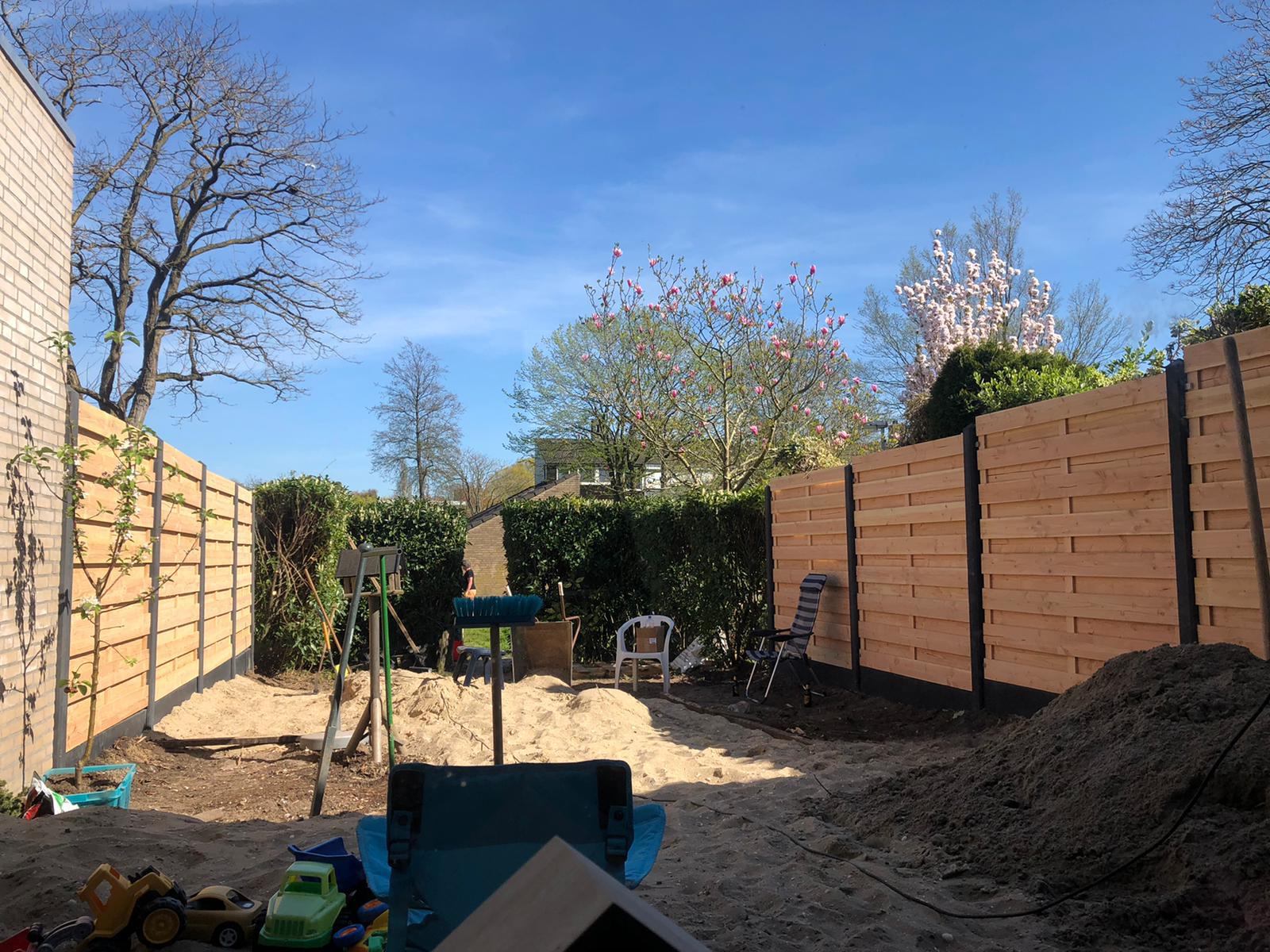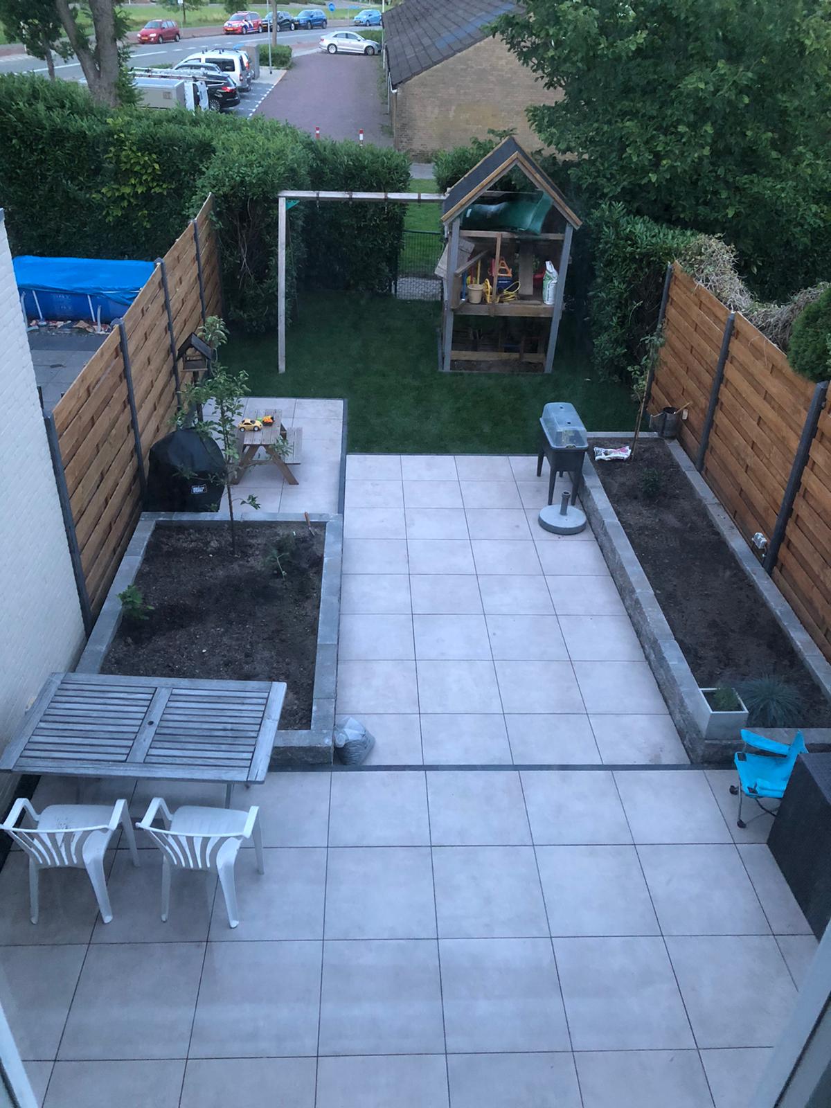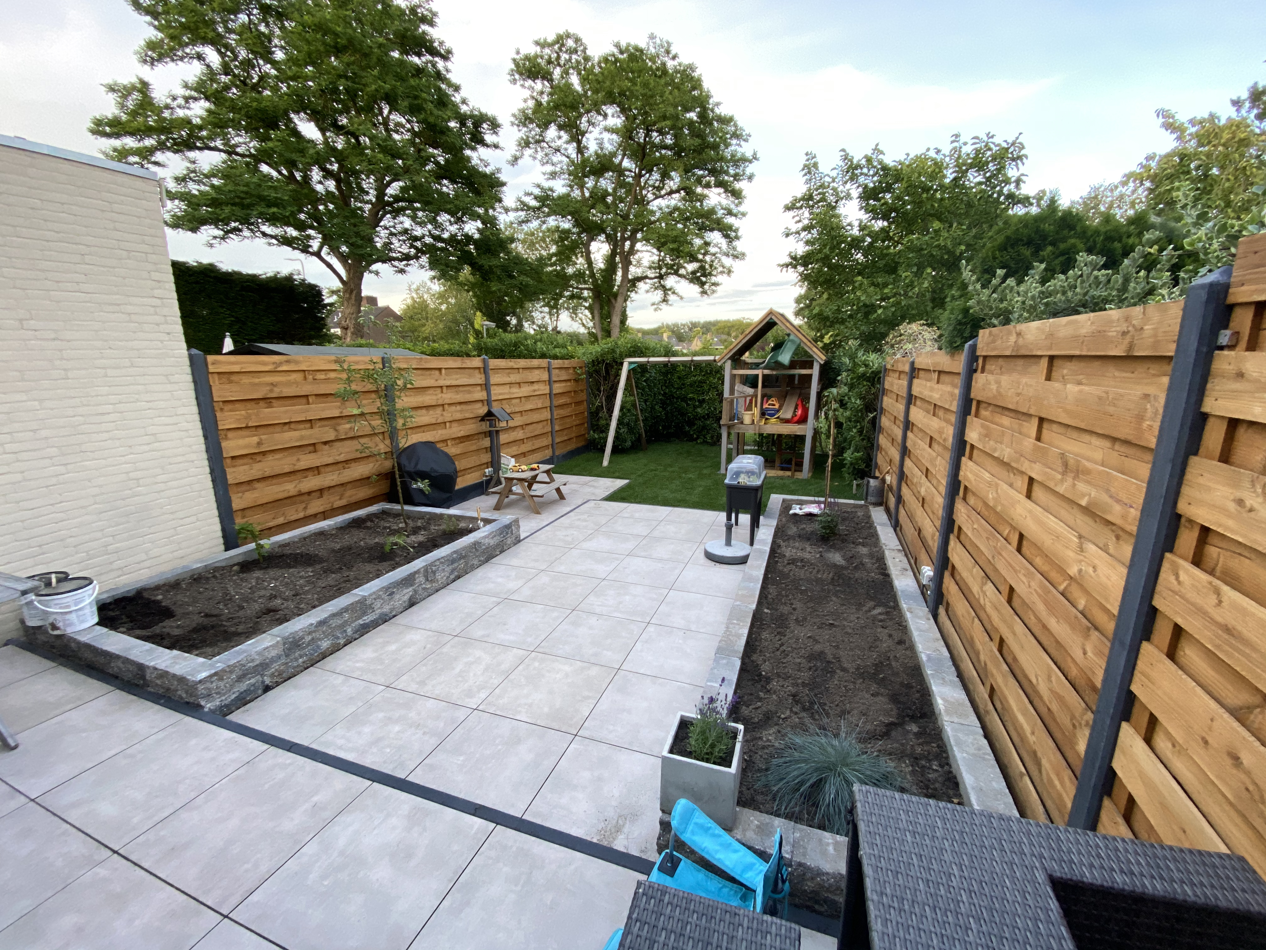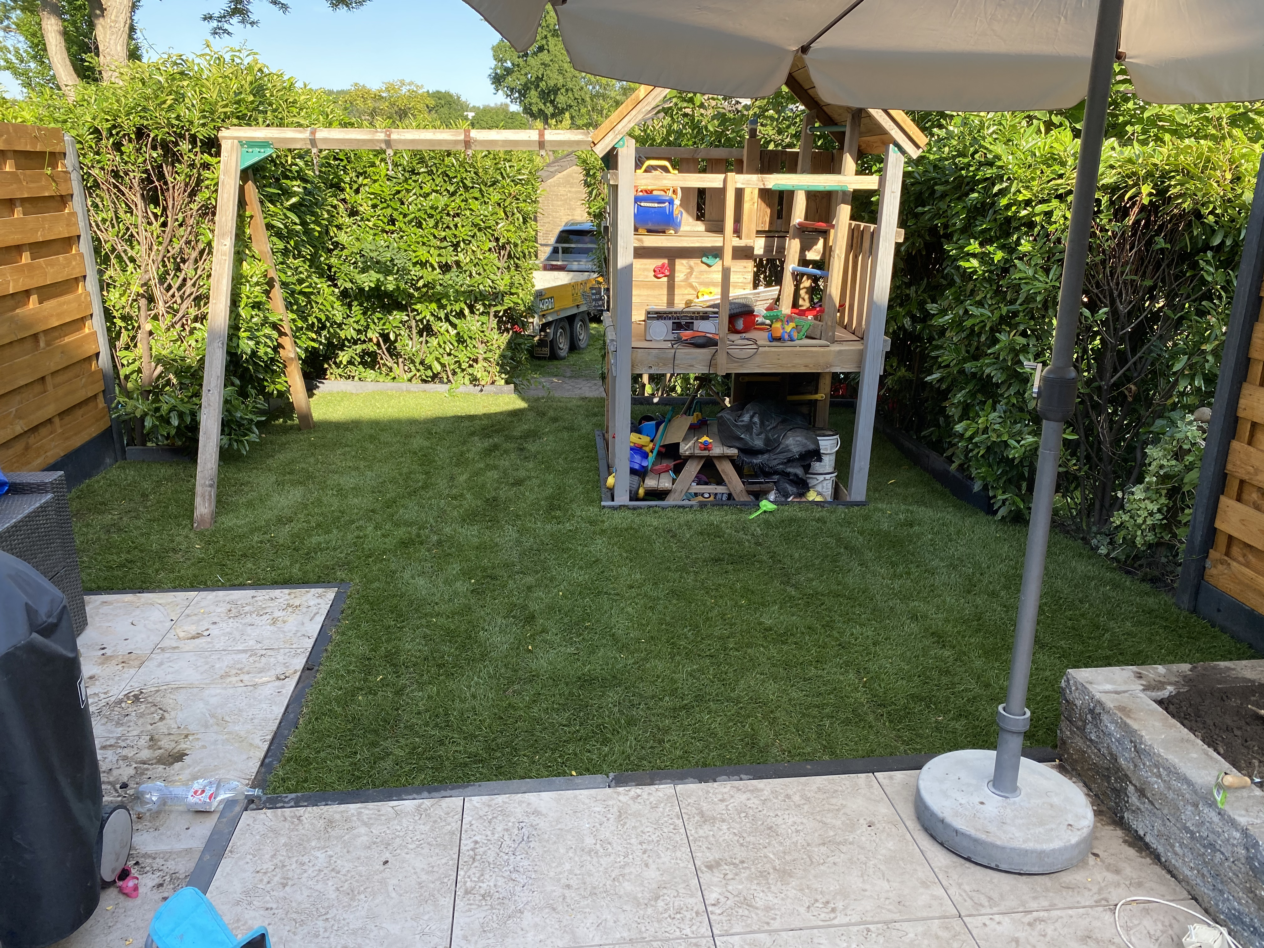 Tuin renovatie in tuin met afschot groter dan 1m . Plaatsen van Douglas tuinschermen inclusief antraciet betonpalen en onderplaten, installatie en op maat maken van een 2e hands Jungle Jim, inclusief nieuw dak. Grondkering en ophoging van tuin, daarna grasmatten leggen. Terrastegels en border-bakken zijn extern geplaatst.