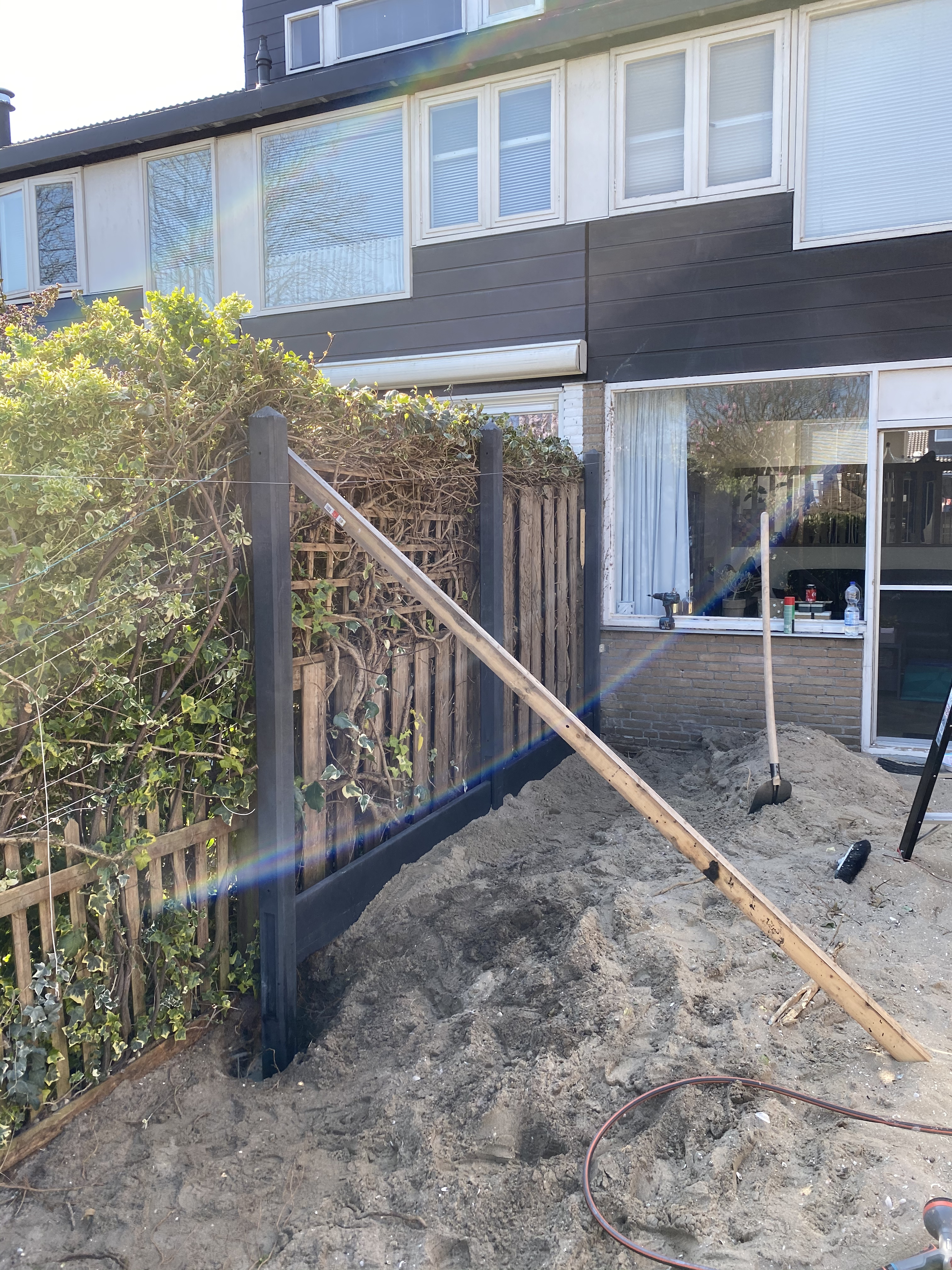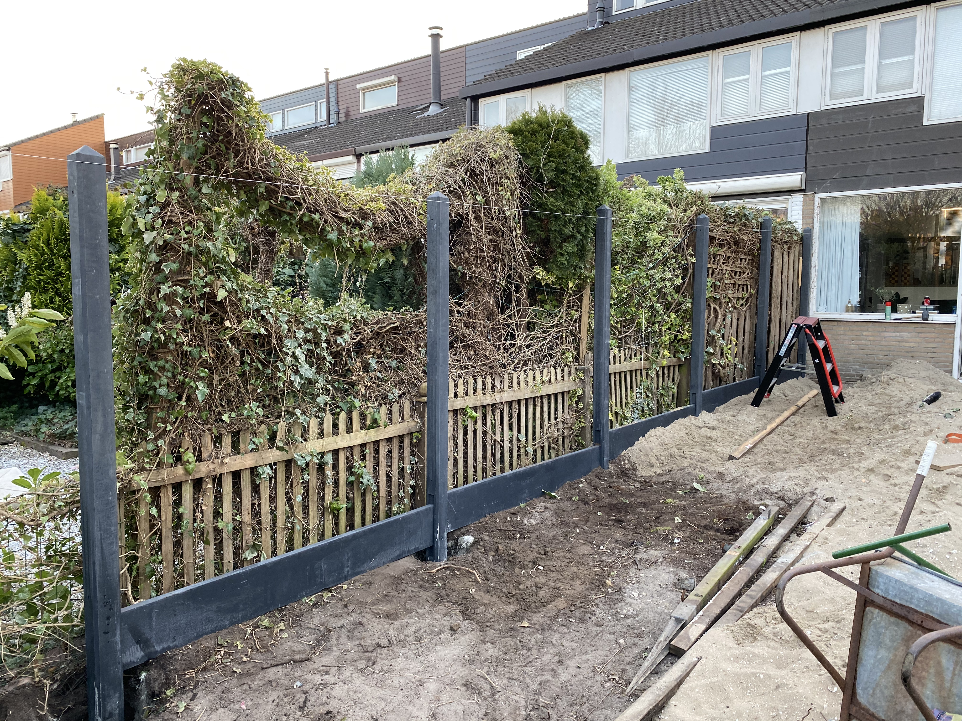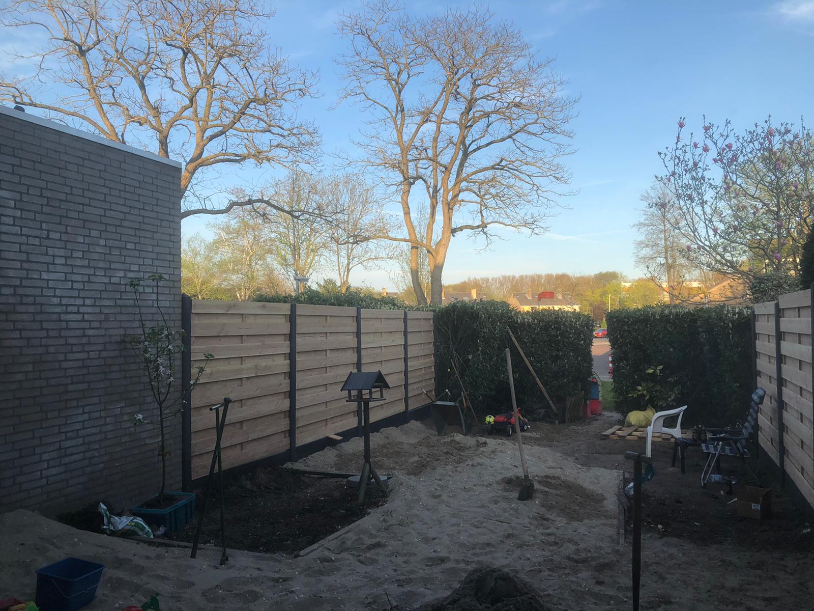 Tuin renovatie in tuin met afschot groter dan 1m . Plaatsen van Douglas tuinschermen inclusief antraciet betonpalen en onderplaten, installatie en op maat maken van een 2e hands Jungle Jim, inclusief nieuw dak. Grondkering en ophoging van tuin, daarna grasmatten leggen. Terrastegels en border-bakken zijn extern geplaatst.