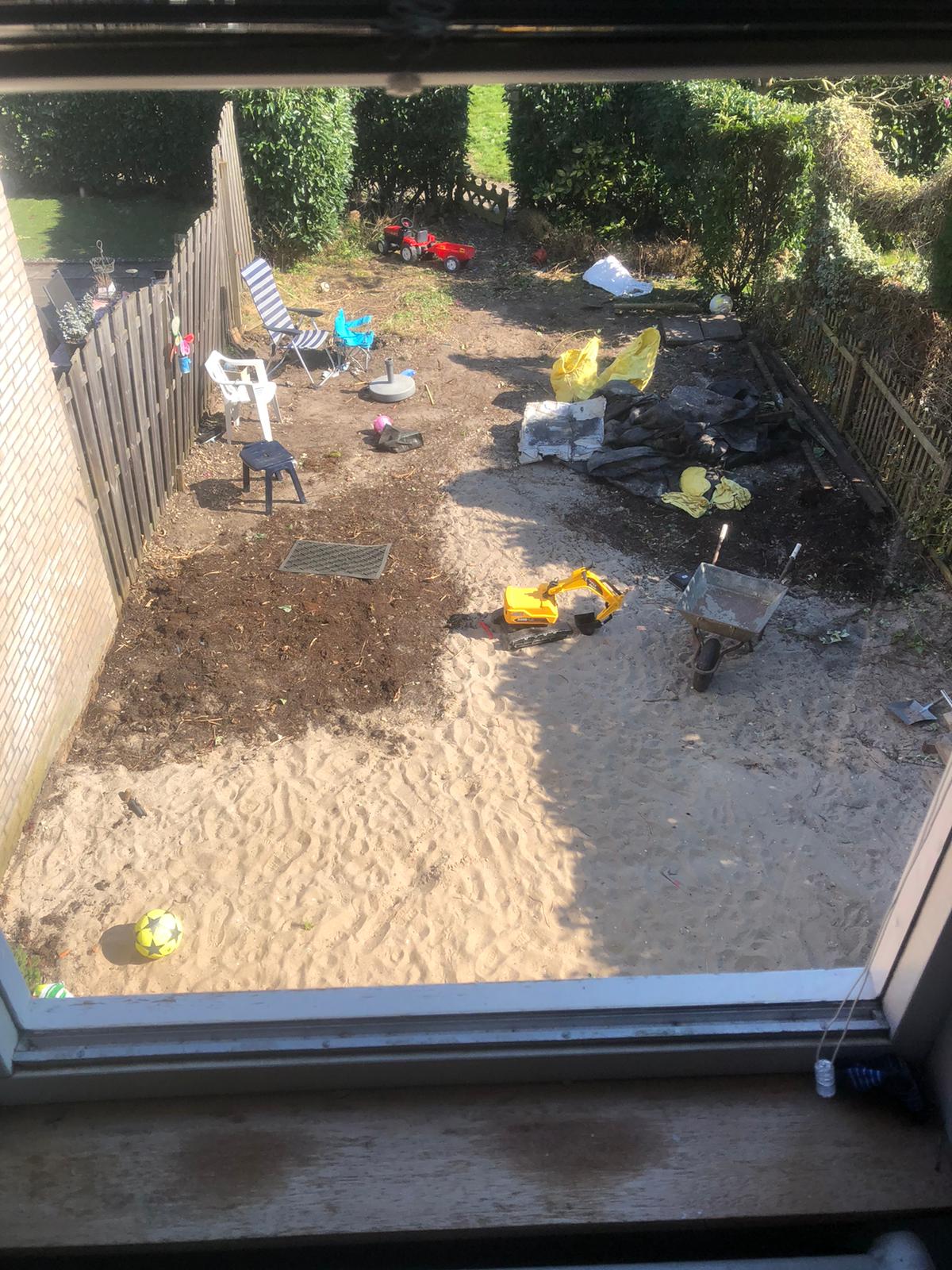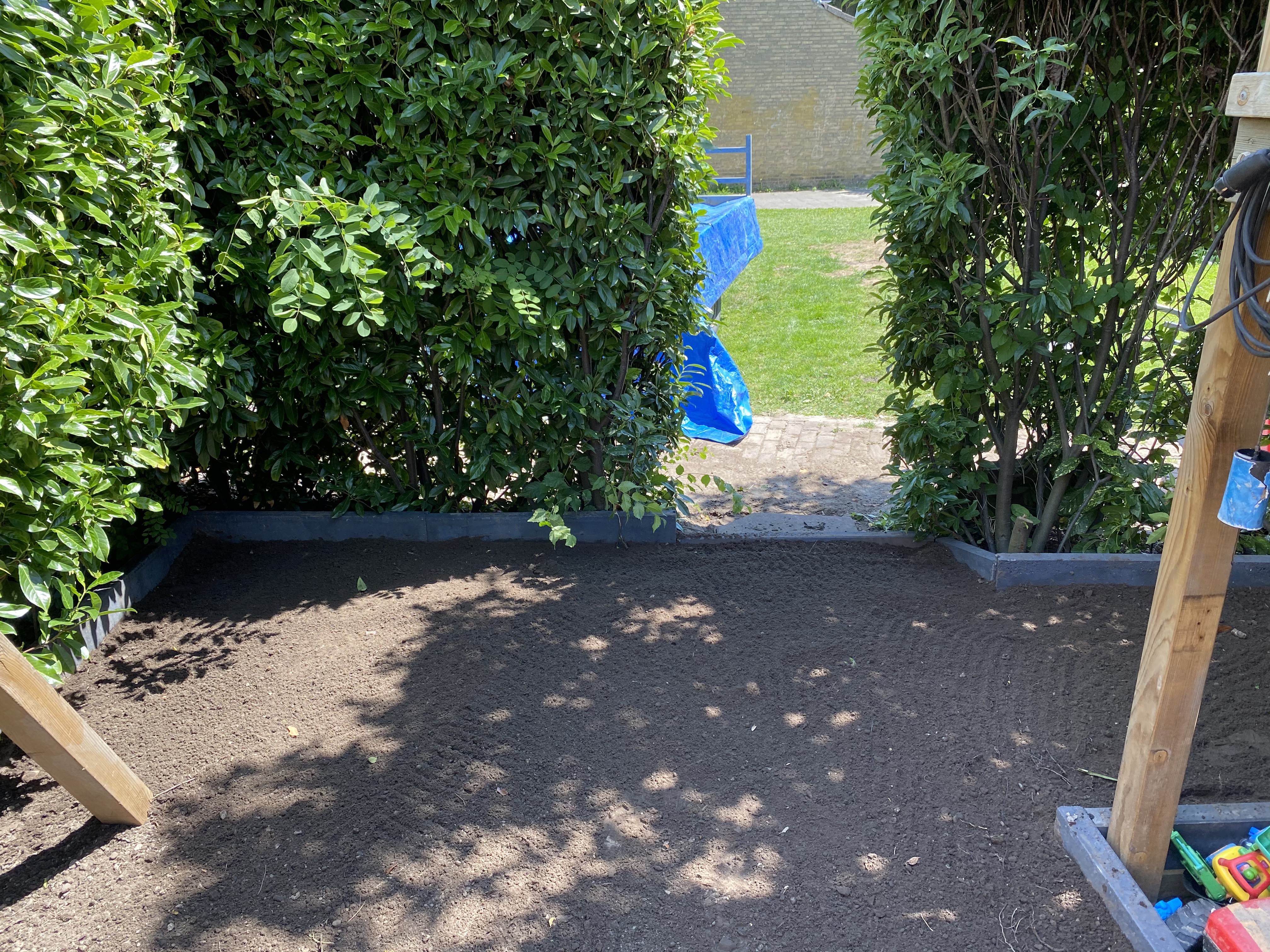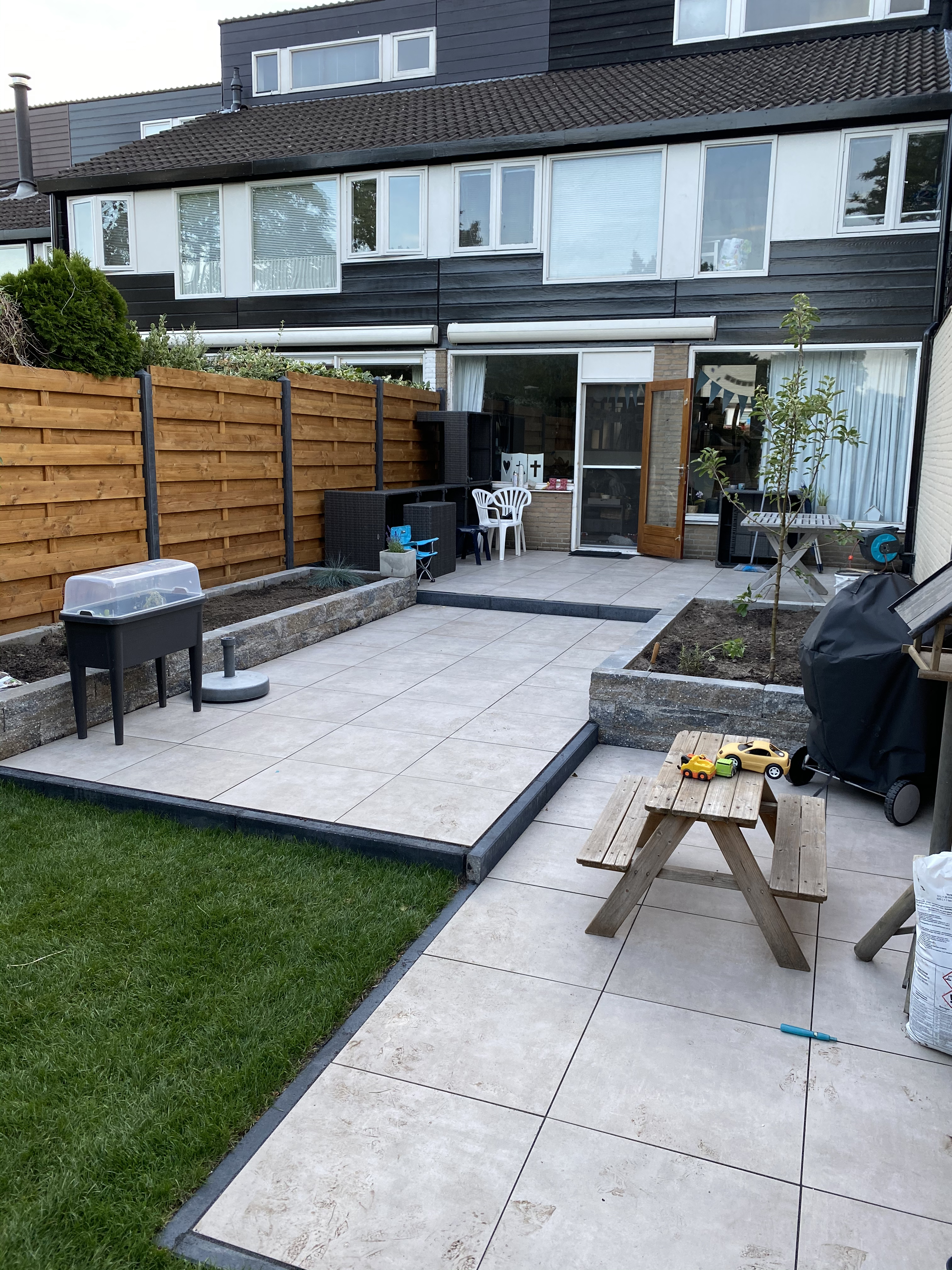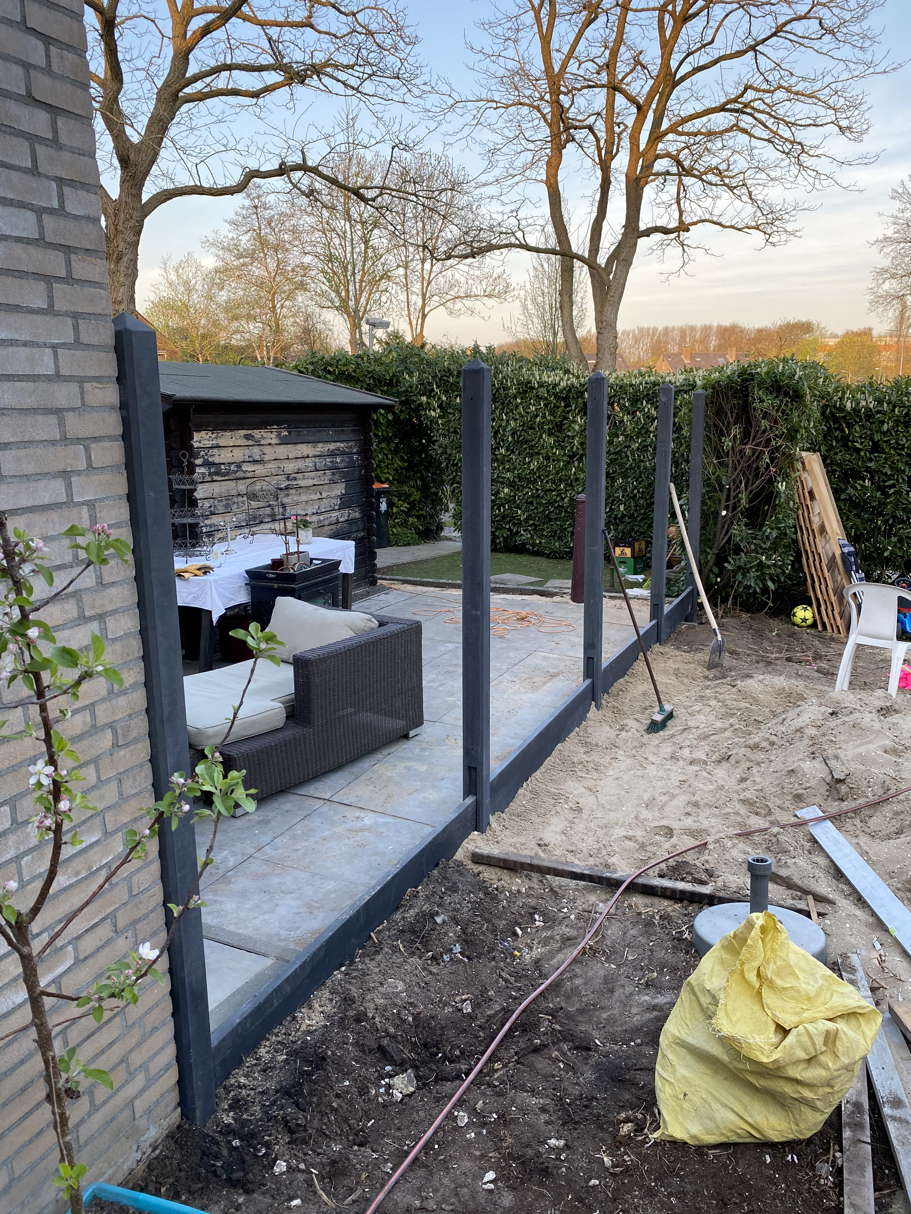 Tuin renovatie in tuin met afschot groter dan 1m . Plaatsen van Douglas tuinschermen inclusief antraciet betonpalen en onderplaten, installatie en op maat maken van een 2e hands Jungle Jim, inclusief nieuw dak. Grondkering en ophoging van tuin, daarna grasmatten leggen. Terrastegels en border-bakken zijn extern geplaatst.